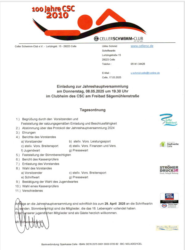Am Donnerstag 08.05.2025 um 19.30 Uhr findet die Jahreshauptversammlung des Celler Schwimm-Club e.V. statt. Alle Mitglieder sind herzlich eingeladen!